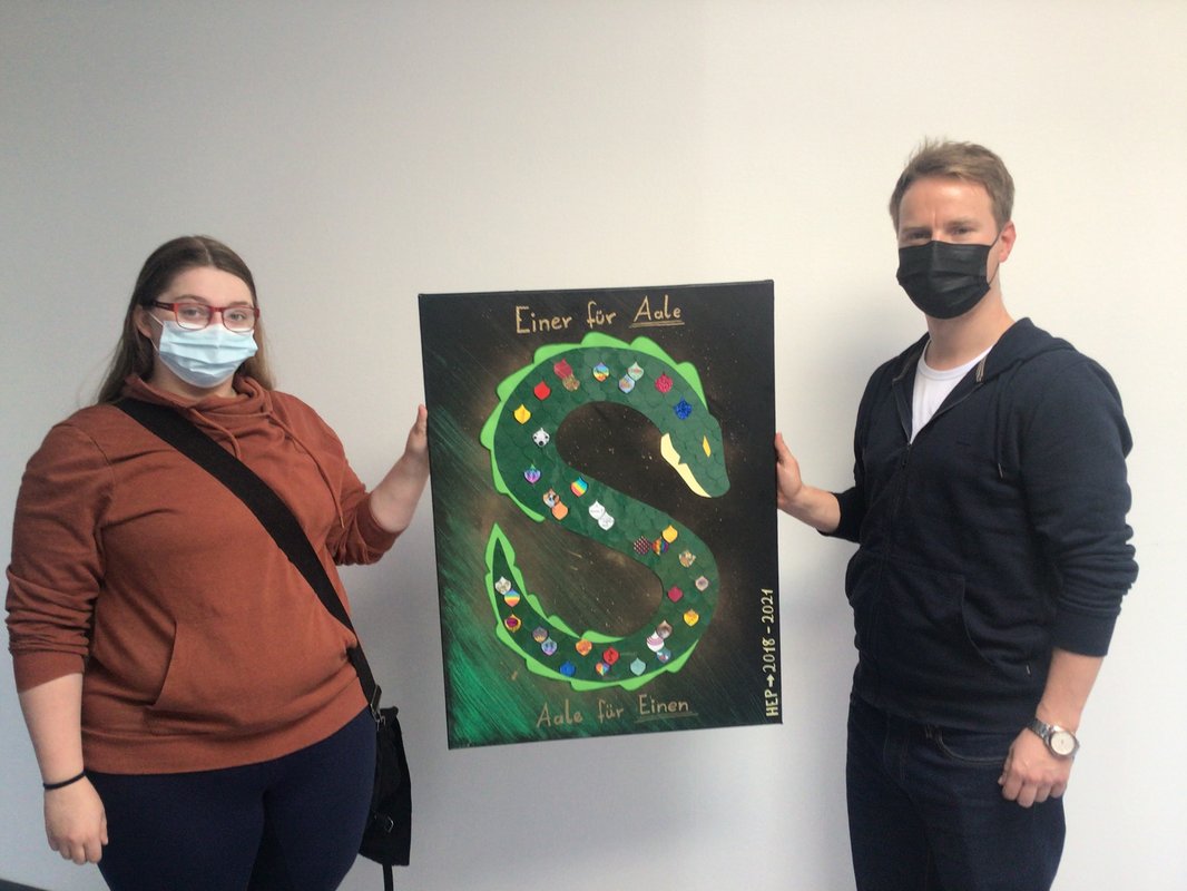 Stellvertretend hat Michelle Brüßel das Bild an ihren ehemaligen Klassenlehrer Julian Kerkemeier übergeben. „Wir wollten etwas zusammen gestalten, da unser Klassenzusammenhalt immer groß war. Genau das soll das Bild ausdrücken“, erläutert die ehemalige Studierende. Hinter dem dargestellten Aal und dem Motto „Einer für Aale - Aale für Einen“ steckt ein Witz zwischen der Klasse und ihrem damaligen Klassenlehrer, die sich selbst als „Aal Stars“ bezeichnen. Wo genau das Bild hingehängt werden soll, steht noch nicht fest. Fest steht allerdings: Sobald es seinen Platz gefunden hat, wird es kreativ für mehr farbige Erinnerung an die Ehemaligen des Franz Sales Berufskolleg sorgen.